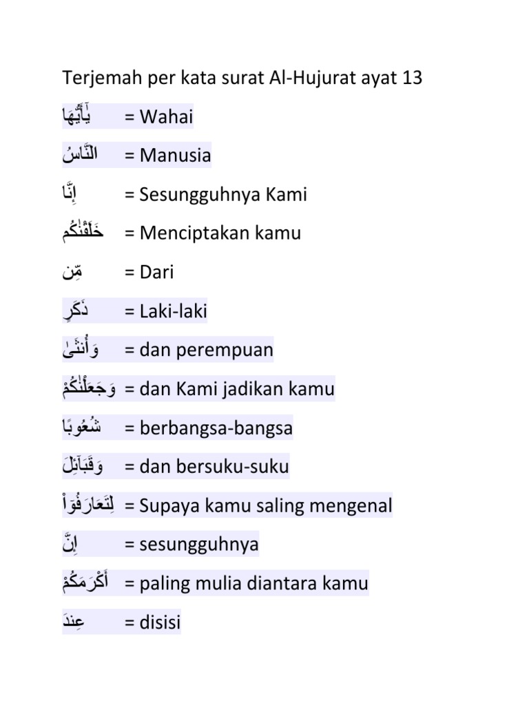 Al hujurat ayat 13 arti perkata. Arti Perkata Surat Al Hujurat Ayat 10 Lengkap Dengan Terjemah Bahasa Indonesia Dan Inggris. Arti Perkata Surat Al-Hujurat Ayat 10 Lengkap Dengan Terjemah Bahasa Indonesia dan Inggris. Yakni Tafsir Ibnu Katsir Tafsir Al Munir Fi Zilalil Quran dan Tafsir Al AzharIsi kandungan ini juga telah dimuat di WebMuslimah dalam judul Isi Kandungan Surat Al Hujurat Ayat 13.
