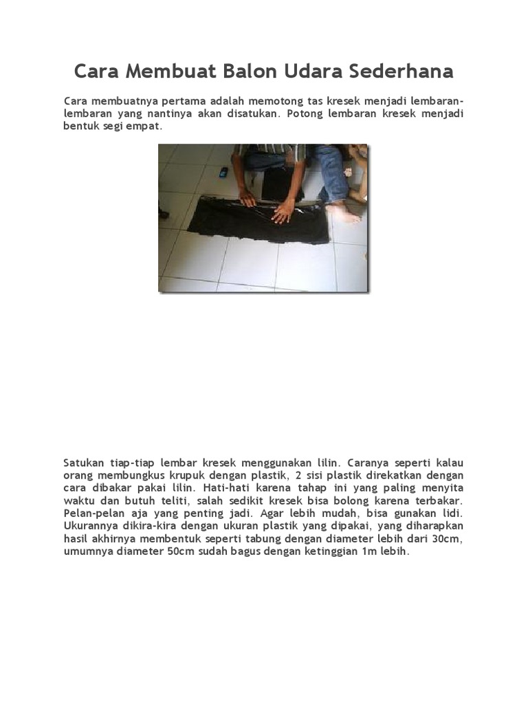 Report Tugas Akhir Modul 3 Laporan Membuat Balon Udara Sederhanapdf Please fill this form we will try to respond as soon as possible. Balon adalah sebuah kantung fleksibel yang umumnya berisikan gas seperti helium hidrogen nitrogen monoksida dan udaraBeberapa jenis balon benar-benar murni digunakan sebagai elemen dekorasi sedangkan jenis lainnya digunakan untuk tujuan-tujuan tertentuBalon-balon pertama dibuat dari bahan mirip membran yang berasal dari hewan animal bladderBalon-balon modern dibuat dari bahan semacam. Report Cara Pembuatan Balon Udara Sederhana Please fill this form we will try to respond as soon as possible.