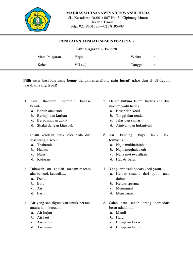 Lengkap Soal Uas Fiqih Mts Kelas 7 Semester 1 Tahun Pelajaran 2018 2019 Siap Ujian